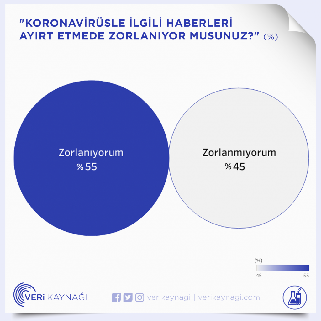 Türkiye'de her 100 kişiden 55'i, Koronavirüs ile ilgili haberler doğru mu, yanlış mı ayırt etmede zorlandığını dile getiriyor.