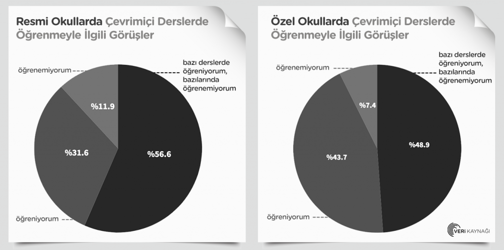 Pandemi sürecinde resmi ve özel okullara giden öğrencilere "Ekran başındaki canlı derslerden öğrenebiliyor musunuz?" diye sorulduğunda; özel okula giden öğrencilerin %43,7'si "Evet, öğreniyorum" cevabını verirken resmi okullara devam eden öğrencilerde bu oran yalnızca %31,6 oldu.